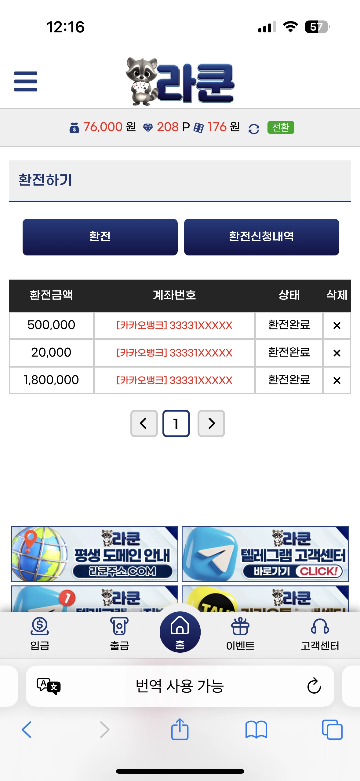 라쿤이라곤 너구리밖에 모르던 제가 어느날 연락이 한통이 왔습니다 그것은 다름아닌 라쿤 깜짝 놀랐죠. 이름도 귀여워서 한번 이용을 해보았으나.. 첫날부터 무려 맥스윈이 터져버렸어요.. 그 뿐만 아니라 신규 이벤트가 많아서 매일매일 해보는데 안터지는 날이 없네요.. 실장님들도 유쾌 하시고 친절하시니까 뭐든 도움주시고 궁금한것들도 다 잘해주시니 환전 빠르고 친절한 귀여운 라쿤에서 이용 하세요!!
